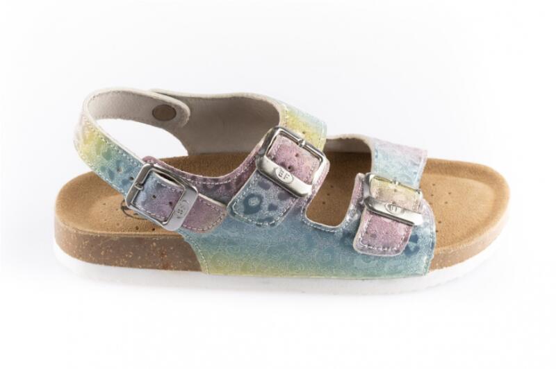 Bőrpapucs szivárványos csillogásban, a sarok körül pánttal, anatómiailag formázott, lélegző, boltíves talpbetéttel. Anyagok: