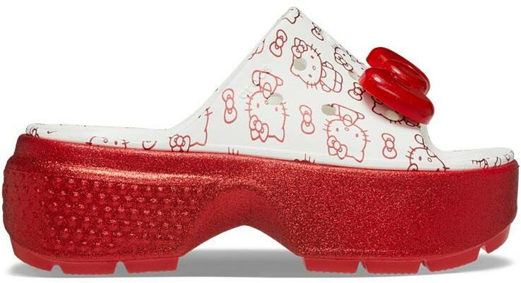 Crocs Hello Kitty Stomp Slide platformos női papucs A Hello Kitty 50. évfordulós kollekciójának része ez a Hello Kitty Siren Clog a rajongóknak készült, akik a globális ikonon nőttek fel, ami soha nem veszítette el a csillogását. Merész, csillogó talppal és kényelemmel tartja a lábakat.  Extravagáns megjelenését tovább fokozzák a 6,9 cm magas platformos talpak, a Hello Kittys mintázat és a két nagy masni formájú Jibbitz papucsdísz. Puha TPU anyagú saroktámasz,  rugalmas és habkönnyű Croslite anyagok biztosítják a kényelmet.  Az ergonómikus talpágy és saroktámasz elnyeli a lépés során kialakult energiákat, a belsőtalp masszírozó bütykei pedig javítják a talp vérkeringését, csökkentik az izomfáradságot.   Croslite alapanyag tulajdonságai: szabadalmaztatott technológia pehelykönnyű felveszi a láb alakját ellenáll a kellemetlen szagoknak, könnyen fertőtleníthető nem hagy anyagnyomot a padlón