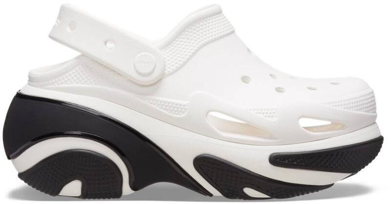Crocs Bubble Crush Clog női platform papucs A Crocs Bubble Crush Clog egy igazán merész papucs, mellyel biztos magára vonzza a tekinteteket. Az utcai stílus és a high fashion ötvözéséből született meg ez az egyedi modell, amely 4 cm-es platform talpával biztosítja a magabiztos lépéseket. Alapanyaga a rugalmas és puha CrosLite, hogy az egész napot 360°-os kényelmben élvezhesse. Az ergonomikus talpágy és saroktámasz csökkenti az ízületek terhelését.  A belső talpán körkörösen elhelyezkedő masszírozó bütykök fokozzák a lábak vérkeringését, harántemelő boltíve pedig egészséges tartást segít elő.  A Jibbitz díszekkel is ékesíthető szellőzőnyílások biztosítják a lábak levegőzését, valamint segítik a víz és szennyeződés elvezetését, míg a forgó sarokpántok elősegítik a biztonságos viseletet. Croslite alapanyag tulajdonságai:szabadalmaztatott technológia pehelykönnyű felveszi a láb alakját ellenáll a kellemetlen szagoknak, könnyen fertőtleníthető nem hagy anyagnyomot a padlón