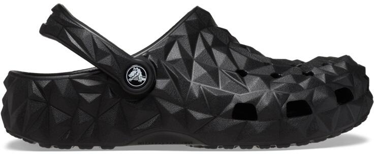 Crocs Classic Geomteric Clog női papucs Ez egy igazán formabontó Crocs papucs geometrikusan formázott kialakítással.  A papucs külseje teljes egészében 3 dimenziósan formált, 3-4-5 szögletű geometrikus formák és gúlák borítják. Puha és rugalmas CrosLite alapanyaga kis súlyt, az Iconic Crocs Comfort fejlesztés hagyományos Crocs kényelmet nyújt, a felhajtható sarokpántja pedig magabiztos járást tesz lehetővé.  Az ergonomikus talpágy és saroktámasz elvezeti a lépés során kialakult energiákat, csökkenti az ízületek terhelését.  Belső talpán körkörös irányban végigfutó masszírozó bütykök fokozzák a vérkeringést, harántemelő boltíve pedig egész napos kényelmet biztosít.  A papucs megtartotta a jellegzetes, Jibibtzekkel kiegészíthető szellőzőnyílásokat. Croslite alapanyag tulajdonságai: szabadalmaztatott technológia pehelykönnyű felveszi a láb alakját ellenáll a kellemetlen szagoknak, könnyen fertőtleníthető nem hagy anyagnyomot a padlón