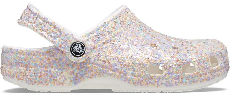 Crocs Classic Glitter Clog női papucs Kifejezetten a hölgyek számára készült papucs, a Crocs klasszikus modelljének csillogós változata. Tartós és rugalmas CrosLite alapanyaga biztosítja az egész napos kényelmet, a forgó sarokpántok pedig a biztonságos viseletet.  Szellőzőnyílások biztosítják a lábak levegőzését, valamint segítik a víz és szennyeződés elvezetését, és óhajtják a Jibbitz díszeket. A papucs belső talpán körkörösen megtalálható masszírozó bütykök fokozzák a vérkeringést, harántemelő boltíve pedig egész napos kényelmet biztosít, míg az ergonomikus talpágy és saroktámasz elvezeti a lépés során kialakult energiákat.   Croslite alapanyag tulajdonságai: szabadalmaztatott technológia pehelykönnyű felveszi a láb alakját ellenáll a kellemetlen szagoknak, könnyen fertőtleníthető nem hagy anyagnyomot a padlón