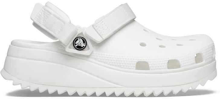 Crocs Classic Hiker Clog női és férfi papucs A Crocs alapmodelljének egy különleges, robosztus változata 10 mm-es platformos megemléssel és a jól tapadó fűrészfogas talpakkal. A jellegzetes, Jibbitzekkel díszíthető szellőzőnyílások, valamint a tartós és rugalmas, kényelmet biztosító CrosLite alapanyag itt is adott. Ez a modell tépőzárral állítható és elforgatható széles sarokpántokkal rendelkezi, melyek extra párnázott sarokelemet kaptak, így biztosan és kényelmes tartja a lábakat akár a szabadban is.  A belső talpakon körkörösen elhelyezkedő masszírozó bütykök fokozzák a lábak vérkeringését, harántemelő boltíve pedig az Iconic Crocs Comfort technológiával párosulva biztosítja az egész napos kényelmet.  Az ergonomikus talpágy és saroktámasz elvezeti a lépés során kialakult energiákat, csökkenti az ízületek terhelését. Croslite alapanyag tulajdonságai: szabadalmaztatott technológia pehelykönnyű felveszi a láb alakját ellenáll a kellemetlen szagoknak, könnyen fertőtleníthető nem hagy anyagnyomot a padlón