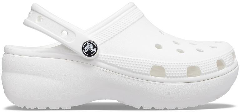 Crocs Classic Platform Clog W női papucs Ez a platformos női papucs a gyártó alapmodelljére, a Classicra épült, megemelt, 41 mm magas talpakkal. Ezzel együtt megőrizte a jellegzetes szellőző nyílásokat, ami szinte kiált a Jibbitz díszek után. A puha és rugalmas CrosLite alapanyag kis súlyt és hagyományos Crocs kényelmet biztosít otthon, a szabadban vagy akár a strandon.  Felhajtható sarokpántja biztosan tartja a lábakat, így a szabadban is magabiztos járást tesz lehetővé.  Az ergonomikus talpágy és saroktámasz elvezeti a lépés során kialakult energiákat, csökkenti az ízületek terhelését.  Belső talpán körkörös irányban végigfutó masszírozó bütykök fokozzák a vérkeringést, harántemelő boltíve pedig elősegíti a helyes lábtartást. Croslite alapanyag tulajdonságai: szabadalmaztatott technológia pehelykönnyű felveszi a láb alakját ellenáll a kellemetlen szagoknak, könnyen tisztítható