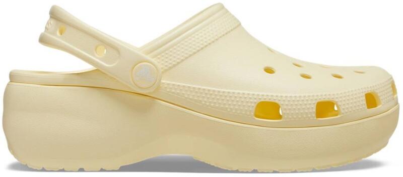 Crocs Classic Platform Clog W női papucs Ez a platformos női papucs a gyártó alapmodelljére, a Classicra épült, megemelt, 41 mm magas talpakkal. Ezzel együtt megőrizte a jellegzetes szellőző nyílásokat, ami szinte kiált a Jibbitz díszek után. A puha és rugalmas CrosLite alapanyag kis súlyt és hagyományos Crocs kényelmet biztosít otthon, a szabadban vagy akár a strandon.  Felhajtható sarokpántja biztosan tartja a lábakat, így a szabadban is magabiztos járást tesz lehetővé.  Az ergonomikus talpágy és saroktámasz elvezeti a lépés során kialakult energiákat, csökkenti az ízületek terhelését.  Belső talpán körkörös irányban végigfutó masszírozó bütykök fokozzák a vérkeringést, harántemelő boltíve pedig elősegíti a helyes lábtartást. Croslite alapanyag tulajdonságai: szabadalmaztatott technológia pehelykönnyű felveszi a láb alakját ellenáll a kellemetlen szagoknak, könnyen tisztítható
