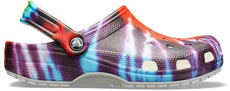Crocs Classic Tye Die Graphic Clog férfi és női papucs Egyedi, batikolt hatást keltő mintázatokkal díszitett papucs, ami a gyártó klasszikus alapmodelljének színes változata, jellegzetes szellőzőnyílásai Jibbitz díszekkel varázsolható még testhezállóbbá. Tartós és rugalmas CrosLite alapanyaga kis súlyt és hagyományos Crocs kényelmet biztosít.  Felhajtható sarokpántja biztosan tartja a lábakat, így a szabadban is magabiztos járást tesz lehetővé.  Belső talpán körkörös irányban végigfutó masszírozó bütykök fokozzák a vérkeringést, harántemelő boltíve pedig egész napos kényelmet biztosít.  Az ergonomikus talpágy és saroktámasz elvezeti a lépés során kialakult energiákat, csökkenti az ízületek terhelését.   Croslite alapanyag tulajdonságai:szabadalmaztatott technológia pehelykönnyű felveszi a láb alakját ellenáll a kellemetlen szagoknak, könnyen fertőtleníthető nem hagy anyagnyomot a padlón