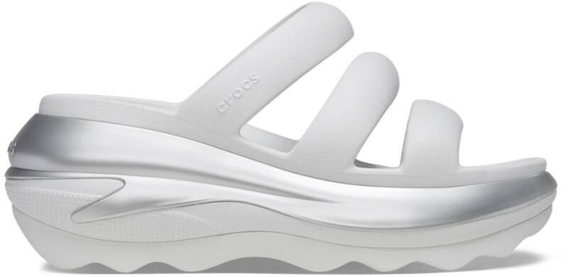 Crocs Mega Crush Metallic Triple Strap női platformos papucs Ez a formabontó Crocs női papucs egyedi, hullámosra formázott talpával és szélesre kialakított tripla keresztpántjával a Mega Crush széria egyik legszebb, legmodernebb darabja.  A Croslite anyagokból készült platformos papucs egyszerre tartós és stílusos. A felsőrész kiváló minőségű anyagból készült, amely egyszerre puha és rugalmas, és érintésre luxus érzetet nyújt.   A talpbetétet puha és támogató habszivaccsal bélelték ki, amely minden lépésnél bölcsőbe helyezi a lábat, kivételes párnázottságot és alátámasztást biztosítva. Ezenkívül a papucs belsejében egyedülálló, tömörítéssel formázott EVA középtalp található, amelyet úgy terveztek, hogy egész napos kényelmet biztosítson. A papucs talpa tartós gumiból készült, amely kiváló tapadást biztosít a legkülönbözőbb felületeken, így biztosítva, hogy ezeket a klumpákat magabiztosan viselhesse, bárhová is vigye a napja. Platformos, magasított talpa 6,4 cm sarokmagasságot biztosít. Croslite alapanyag tulajdonságai: szabadalmaztatott technológia pehelykönnyű felveszi a láb alakját ellenáll a kellemetlen szagoknak, könnyen fertőtleníthető nem hagy anyagnyomot a padlón