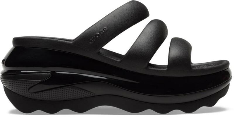 Crocs Mega Crush Triple Strap női platformos papucs Ez a formabontó Crocs női papucs egyedi, hullámosra formázott talpával és szélesre kialakított tripla keresztpántjával a Mega Crush széria egyik legszebb, legmodernebb darabja.  A Croslite anyagokból készült platformos papucs egyszerre tartós és stílusos. A felsőrész kiváló minőségű anyagból készült, amely egyszerre puha és rugalmas, és érintésre luxus érzetet nyújt.   A talpbetétet puha és támogató habszivaccsal bélelték ki, amely minden lépésnél bölcsőbe helyezi a lábat, kivételes párnázottságot és alátámasztást biztosítva. Ezenkívül a papucs belsejében egyedülálló, tömörítéssel formázott EVA középtalp található, amelyet úgy terveztek, hogy egész napos kényelmet biztosítson. A papucs talpa tartós gumiból készült, amely kiváló tapadást biztosít a legkülönbözőbb felületeken, így biztosítva, hogy ezeket a klumpákat magabiztosan viselhesse, bárhová is vigye a napja. Platformos, magasított talpa 6,4 cm sarokmagasságot biztosít. Croslite alapanyag tulajdonságai: szabadalmaztatott technológia pehelykönnyű felveszi a láb alakját ellenáll a kellemetlen szagoknak, könnyen fertőtleníthető nem hagy anyagnyomot a padlón