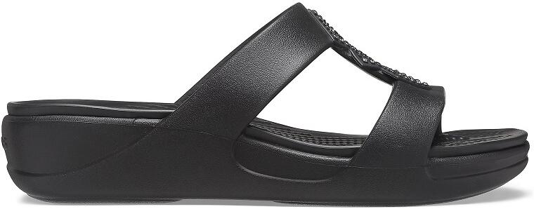 Crocs Monterey Shimmer Slip-On Wedge W női papucs Könnyed nyári viseletet és visszafogott, elegáns megjelenést kölcsönöz ez a női Crocs papucs a széles pántoknak és magasított saroknak köszönhetően.  A rugalmas és tartós Croslite alapanyag, a strasszkövekkel ékesített hosszaníti pánt meggátolja, hogy a lábak csúszkáljanak benne. A papucs anyaga felveszi a láb formáját,  a Dual Crocs Comfort technológia pedig a kontúros lábágyakkal kiegészülve egész nap kényelemben tart. A talpal belső oldalán körkörös irányban végigfutó masszírozó bütykök fokozzák a lábak vérkeringését. Croslite alapanyag tulajdonságai: szabadalmaztatott technológia pehelykönnyű felveszi a láb alakját ellenáll a kellemetlen szagoknak, könnyen fertőtleníthető nem hagy anyagnyomot a padlón