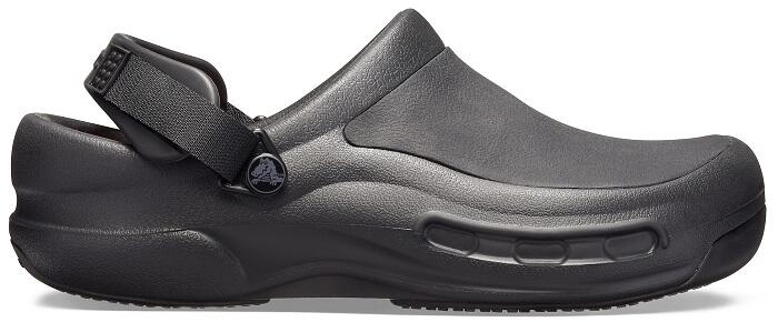 Crocs Work Bistro Pro LiteRide Clog munkapapucs Szakácsoknak és konyhai dolgozóknak kifejlesztett, teljesen öntött és tartós Croslite alapanyagból készült papucs új generációs, puha és rugalmas LiteRide habszerkezettel. A legtöbb munkaügyi előírásnak megfelelő, zárt sarokrésszel és a biztonságot növelő forgó sarokpánttal rendelkezik, valamint a lábközépcsontok felett nagyobb anyagvastagság védi a lábat a külső behatásoktól. Talpa speciális Crocs Lock bordázással készült, mely csúszásmentes, így olajos, nedves, zsíros talajon is megfelelő tapadást biztosít. Az ergonomikus talpágy és saroktámasz elvezeti a lépés során kialakult energiákat, csökkenti az ízületek terhelését. Belső talpán körkörös irányban végigfutó masszírozó bütykök fokozzák a vérkeringést, harántemelő boltíve pedig egész napos kényelmet biztosít. Könnyen tisztítható akár szappanos vízzel is. Tanúsítvány: ASTM F2913-11 tesztelt, CE tanúsítvánnyal Megfelel vagy meghaladja az EN ISO 20347: 2012, OB, SRC értéket Croslite alapanyag tulajdonságai: szabadalmaztatott technológia pehelykönnyű felveszi a láb alakját ellenáll a kellemetlen szagoknak, könnyen fertőtleníthető nem hagy anyagnyomot a padlón