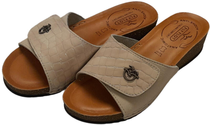 Női bőr papucs, műanyag csuszásgátlos talppal. A talpbetét puha , anti -schock technológiával készült. Ajánlott : utcai használatra, otthonra. Hosszabb sétákra. Normál méretezés. Close