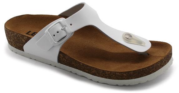 nöi bör, láb ujj köztes papucs, müanyag csúszásgátlós talppal. a szíj bösége csattal szabályozható. a talp anatómiai kialakítású parafa, puha velúrbör talpbetéttel éshabszivacs alsó résszel. ajánlott minden napos otthoni vagy utcai használatra, könnyü nyári sétára ( több órás gyaloglás után sem fárad el a láb ).