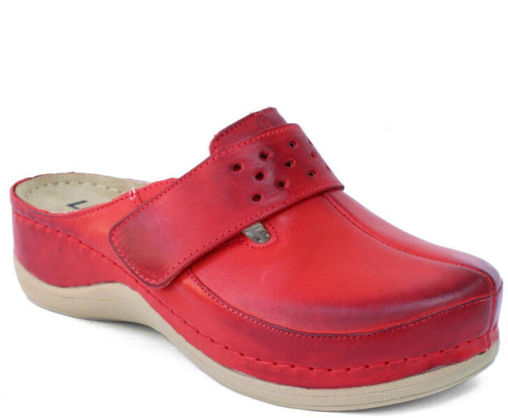Női nappa bőr (nagyon puha felsőrész) klumpa, műanyag csúszásgátlós talppal. Oldalt tépőzár található, amellyel szabályozni lehet a bőséget. A talpbetét puha zselés, bőr. A természetes anyagnak köszönhetően jól szellőzik. Ajánlott: mindennapos utcai használatra, otthonra vagy munkahelyre
