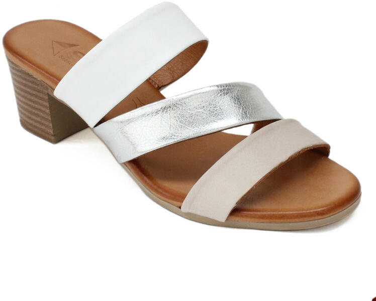 Sherlock Soon divatos nyári modellje bézs ezüst és fehér színt ötvözve, kényelmes sarokmagasságú talpra építve.